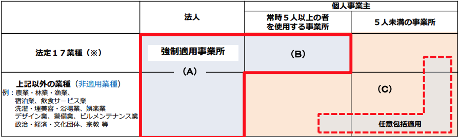よってそれ以外の個人事業主としての、「農林水産業等の第1次産業の事業」「接客娯楽業」「神社、寺院、教会等の宗教業」は、強制適用事務所とはなりません。