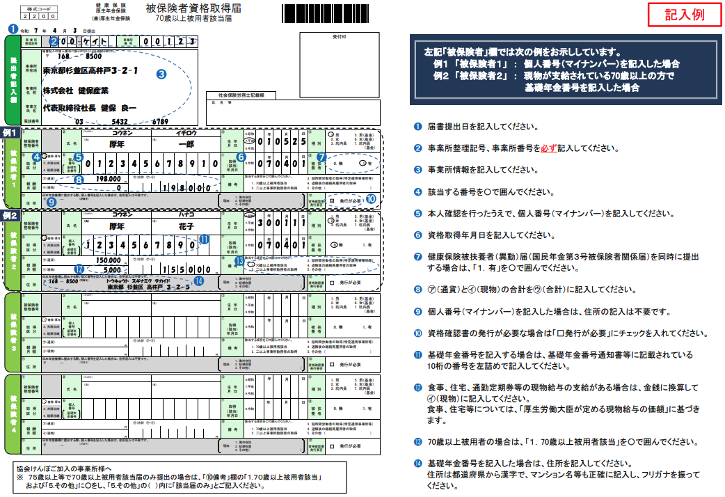 (出典:日本年金機構HP 健康保険・厚生年金保険 被保険者資格取得届/厚生年金保険 70歳以上被用者該当届(記入例))