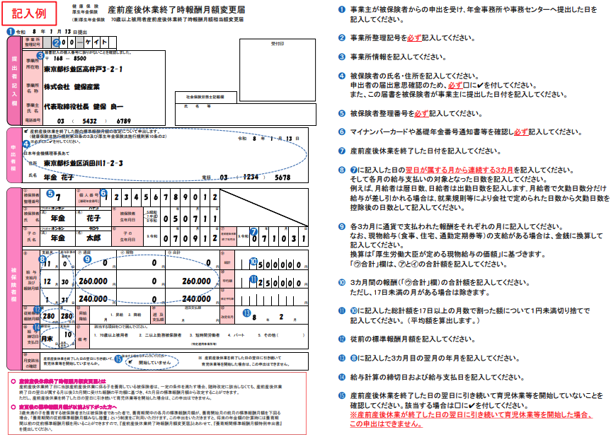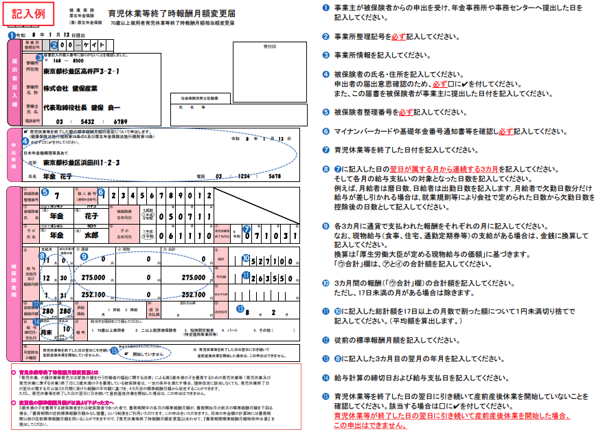 産前産後休業終了時改定の届出は、特に期限が定められているわけではありませんが、被保険者からの申出を受けた事業主が速やかに、「産前産後休業終了時報酬月額変更届」を提出することとされています。記載方法については、下記を参考にしてください。